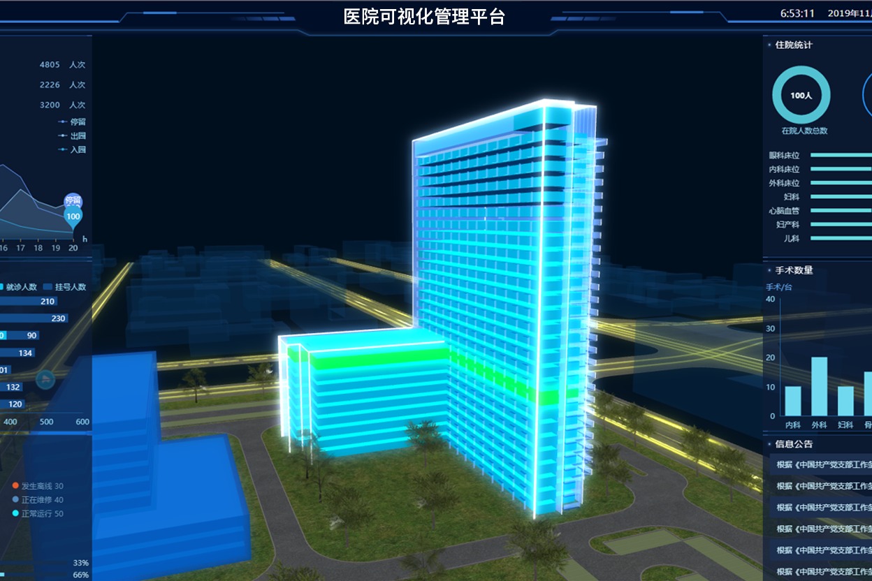 醫院基礎設施的統一管理,并以3D效果展示醫院全貌,現擬建設醫院監控可視化平臺, 實現對醫院基礎設施層的環境、視頻、資產設備等設備的實時數據、設備狀態、告警等的管理。